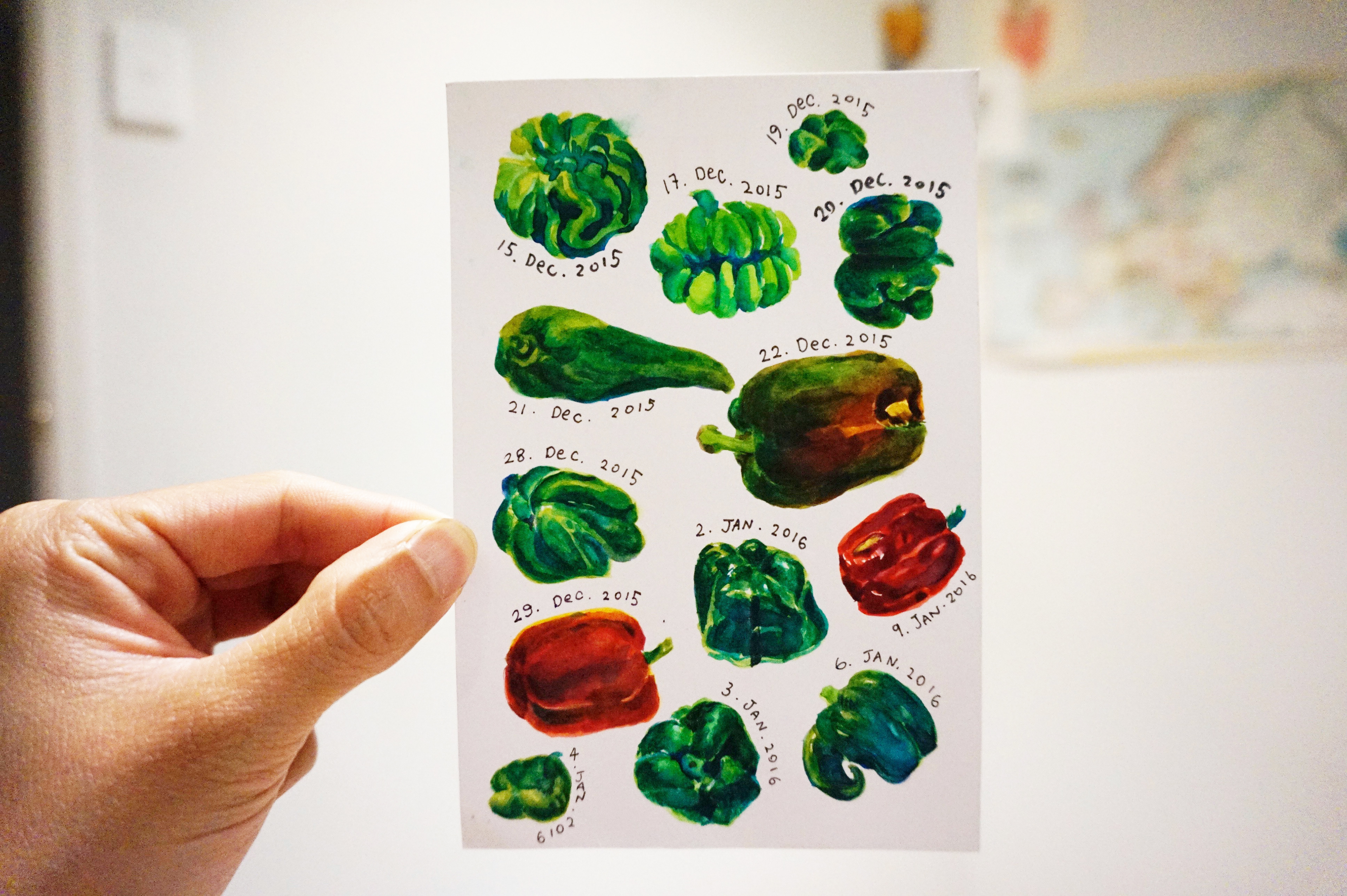 December 2015 to April 2016, I worked in a capsicum farms, graded the quality and distinguished between first ond second class. The ones with odd shapes belong second class, and they are rarely found in the markets or shops. For memorize those which are with the same yummy taste but with ugly looks, I filled postcards with painted capsicums just like I fit them into a box everyday.